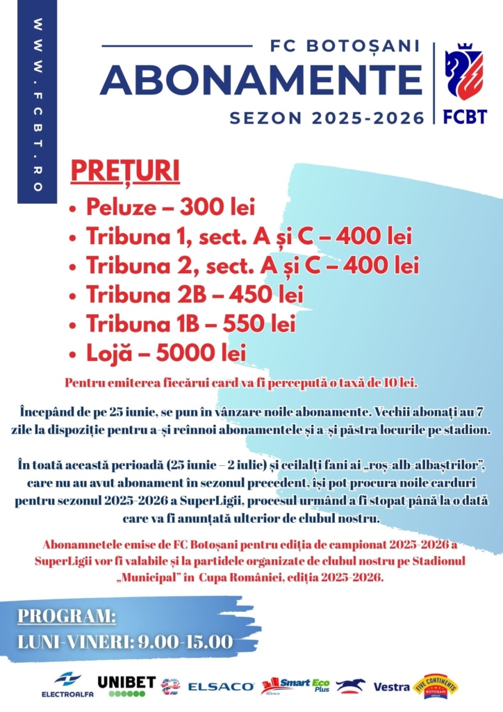 Abonamnetele emise de FC Botoșani pentru ediția de campionat 2025-2026 a SuperLigii vor fi valabile și la partidele organizate de clubul nostru pe Stadionul „Municipal” în competiția Cupa României, ediția 2025-2026.